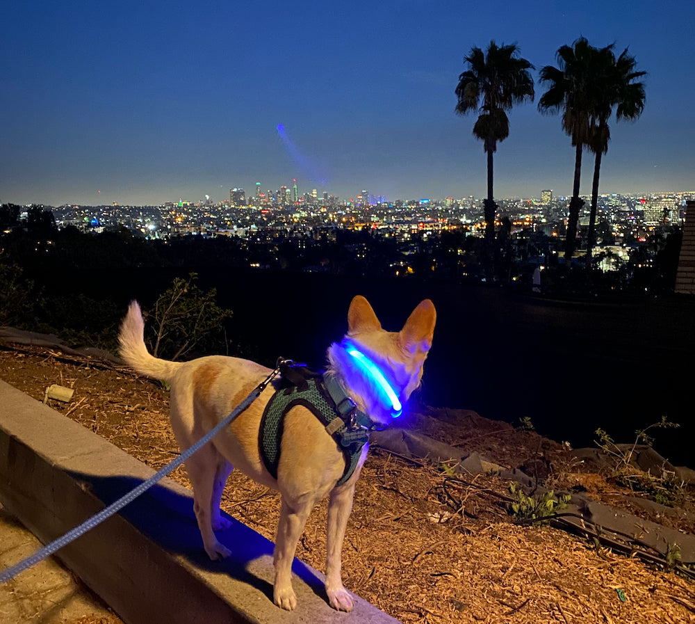 "We love this collar. It's so easy to charge, wear, and be seen. It's one button to turn off and on. No batteries needed and easy to charge. I feel so much better walking at night."